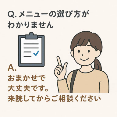 予約時に「メニューをえらんでほしい」を選択して頂くと、当日カウンセリングさせて頂いてご提案します。