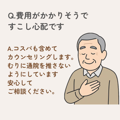 当院では初回のカウンセリングであなたのご希望やお悩みをじっくり伺い、一番合った方法を費用やペース含めて一緒に考えることを大切にしています。
