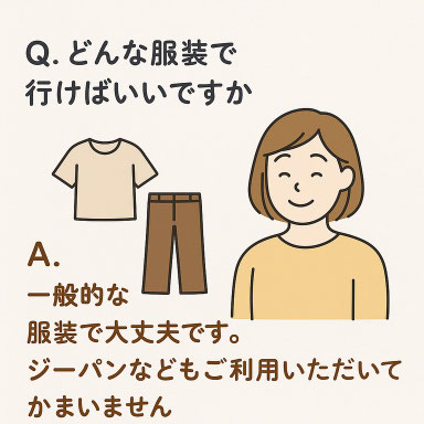 お身体を動かすことが多いので、動きやすい服のほうがベターではあります。