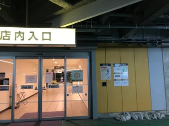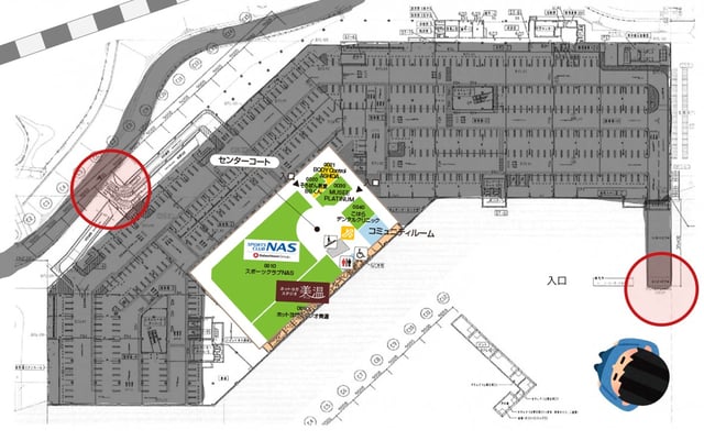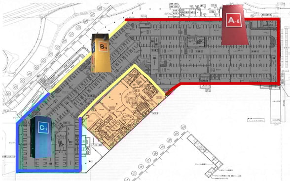 赤(北)・中央(黄)・青(南)と店内入口エリアが柱で色分けしてあります。